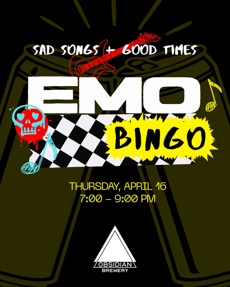 Calling all elder emos - dust off your studded belts and sharpen that eyeliner! Join us for a night of nostalgia-fueled chaos with EMO BINGO at Obsidian Brewery! Free to play, with prizes, beer, and all the feels. We’re not okay… and that’s totally the vibe.