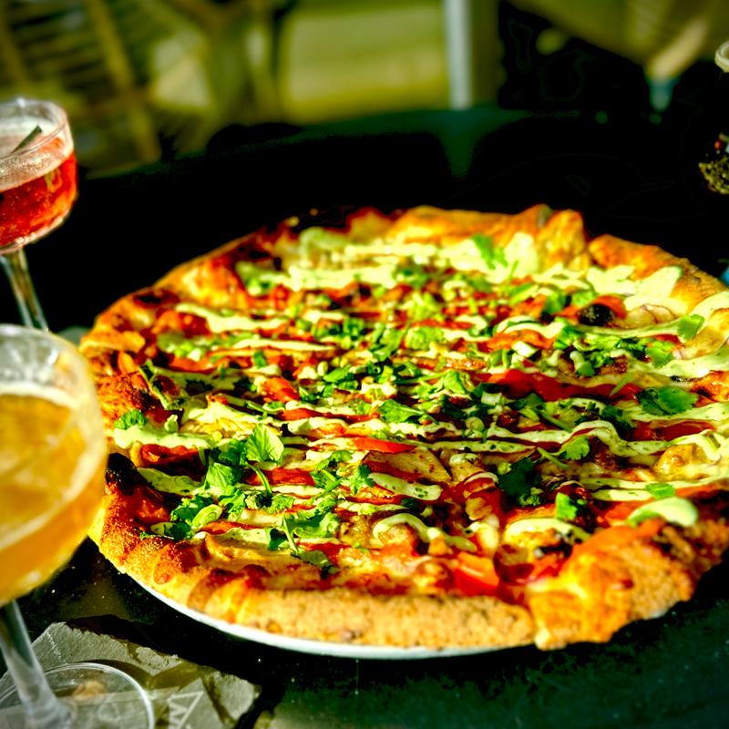 Garlic Oil, Mozzarella, Tandoori Spiced Chicken, Onions, Bell Peppers. Garnished with Tikka Masala Sauce, Creamy Jalapeno, Cilantro, Green Onion